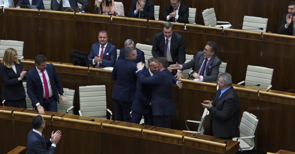 Fotografia zachytáva bujarú radosť koaličných papalášov, keď na tabuli zasvietilo, že 79 poslancov hlasovalo ZA. Celé zle. Tento rozpočet vôbec nemal uzrieť svetlo sveta.